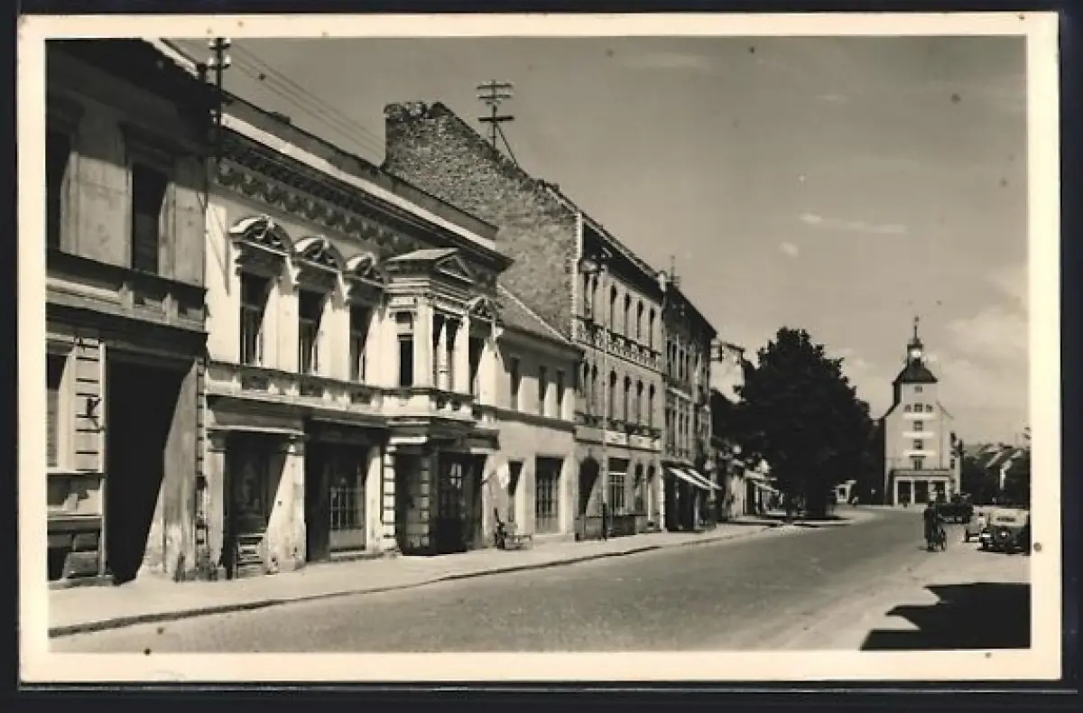 AK Treuenbrietzen, Grossstrasse mit Geschäft von Erika Müller und Kirche