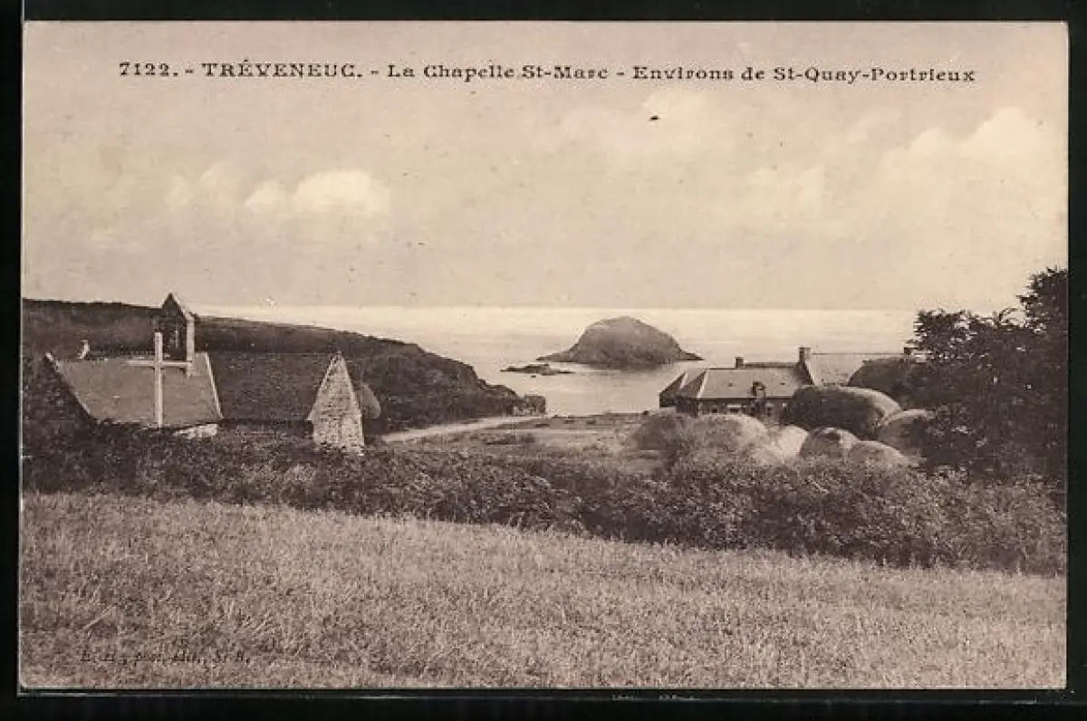 AK Tréveneuc, La Chapelle St-Marc avec vue sur la mer et l`île au loin