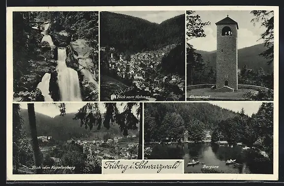 AK Triberg / Schwarzwald, Ehrenmal, Blick vom Hohnen und vom Kapellenberg, Wasserfall und Bergsee
