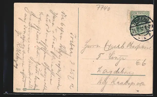 Personenbezogene Daten auf der Rückseite der Karte wurden durch blauen Textmarker unkenntlich gemacht. Die blauen Stellen sind auf die Vorderseite durchgeweicht und wirken sich negativ auf das Postkartenfoto aus