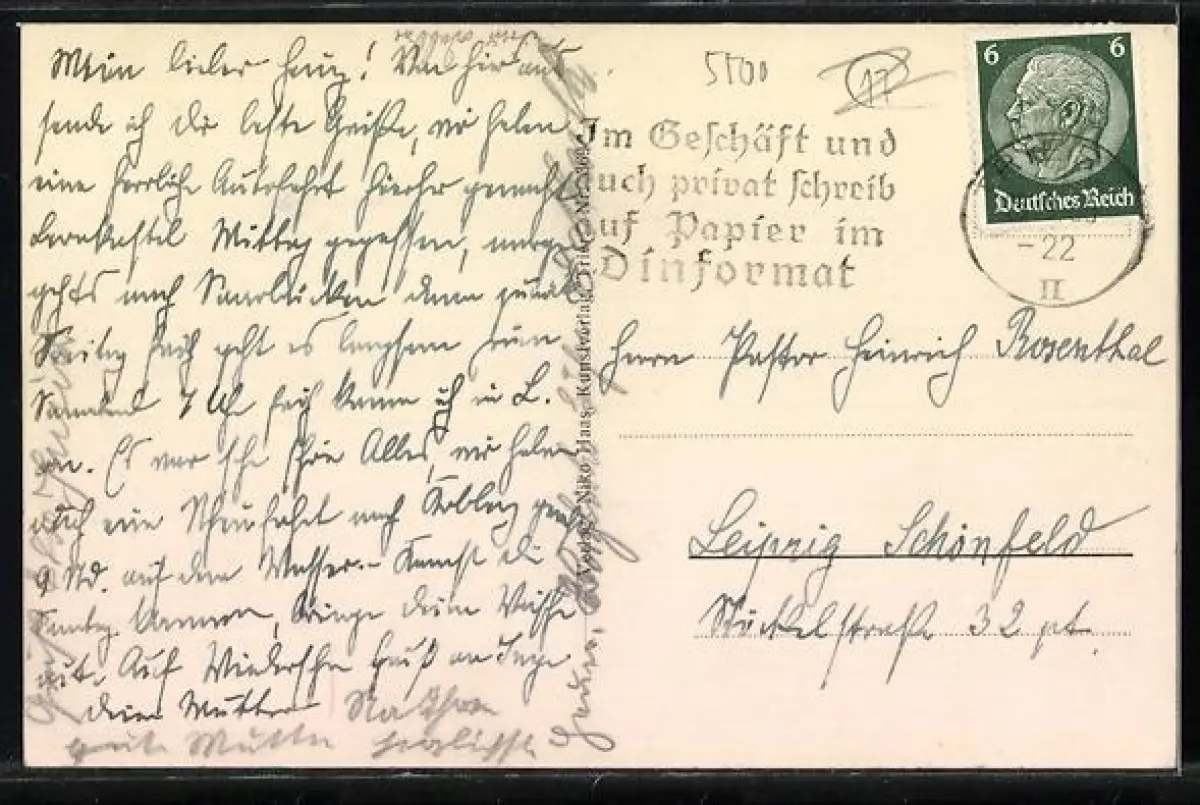Personenbezogene Daten auf der Rückseite der Karte wurden durch blauen Textmarker unkenntlich gemacht. Die blauen Stellen sind auf die Vorderseite durchgeweicht und wirken sich negativ auf das Postkartenfoto aus