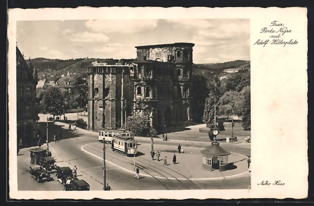 AK Trier, Porta Nigra und platz mit Strassenbahn