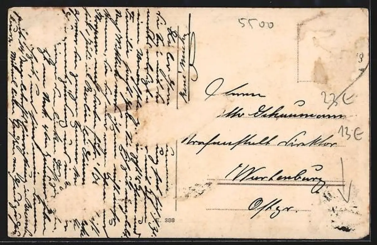 alte Ansichtskarte, gelaufen, Briefmarke entfernt, rückseitig Oberflächenschaden, Eckknick oben rechts