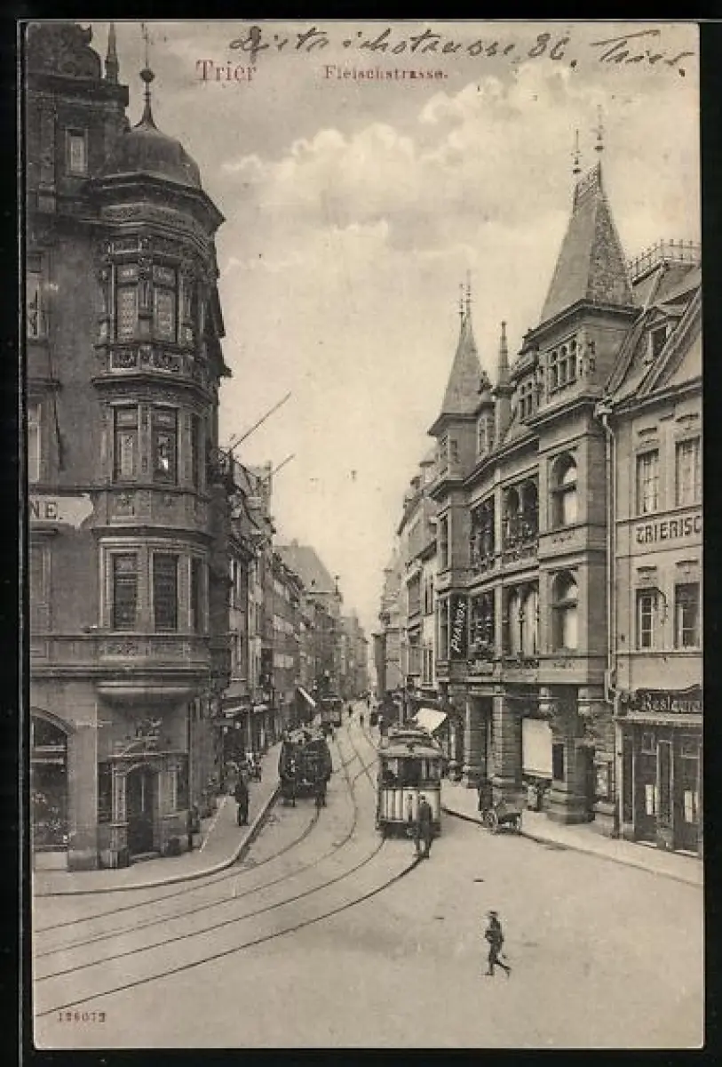 AK Trier, Strassenbahnen in der Fleischstrasse mit Restaurant