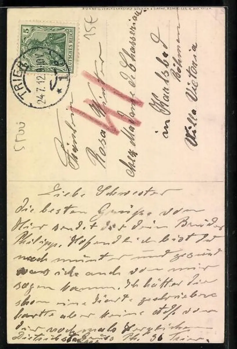 Personenbezogene Daten auf der Rückseite der Karte wurden durch blauen Textmarker unkenntlich gemacht. Die blauen Stellen sind auf die Vorderseite durchgeweicht und wirken sich negativ auf das Postkartenfoto aus