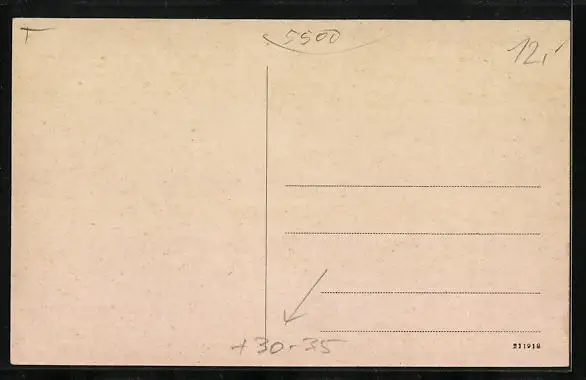 Personenbezogene Daten auf der Rückseite der Karte wurden durch blauen Textmarker unkenntlich gemacht. Die blauen Stellen sind auf die Vorderseite durchgeweicht und wirken sich negativ auf das Postkartenfoto aus