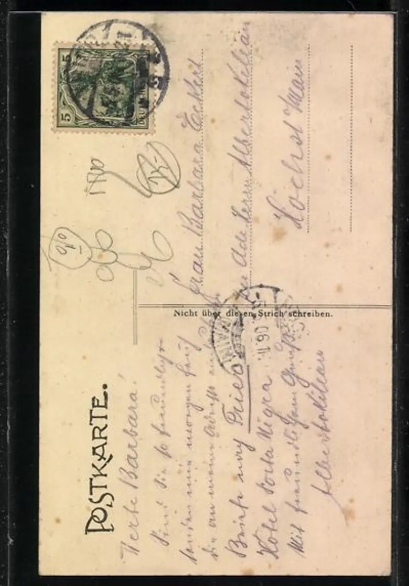 Personenbezogene Daten auf der Rückseite der Karte wurden durch blauen Textmarker unkenntlich gemacht. Die blauen Stellen sind auf die Vorderseite durchgeweicht und wirken sich negativ auf das Postkartenfoto aus
