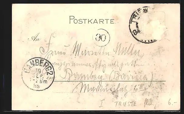 alte Ansichtskarte, gelaufen 1899, Stempelspur, Briefmarke entfernt, rückseitig Oberflächenschaden, guter Zustand