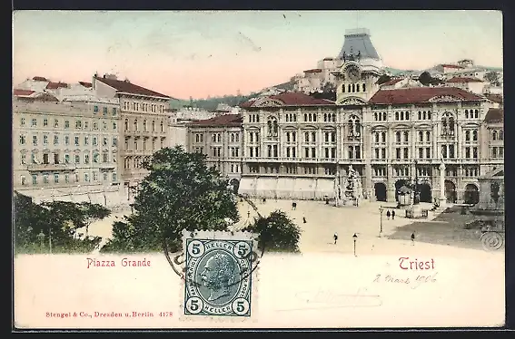 AK Triest, Piazza Grande mit Denkmal und prächtigen Fassaden