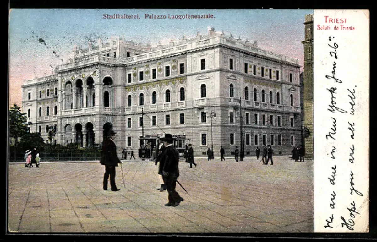 AK Triest, Stadthalterei, Strassenbahn