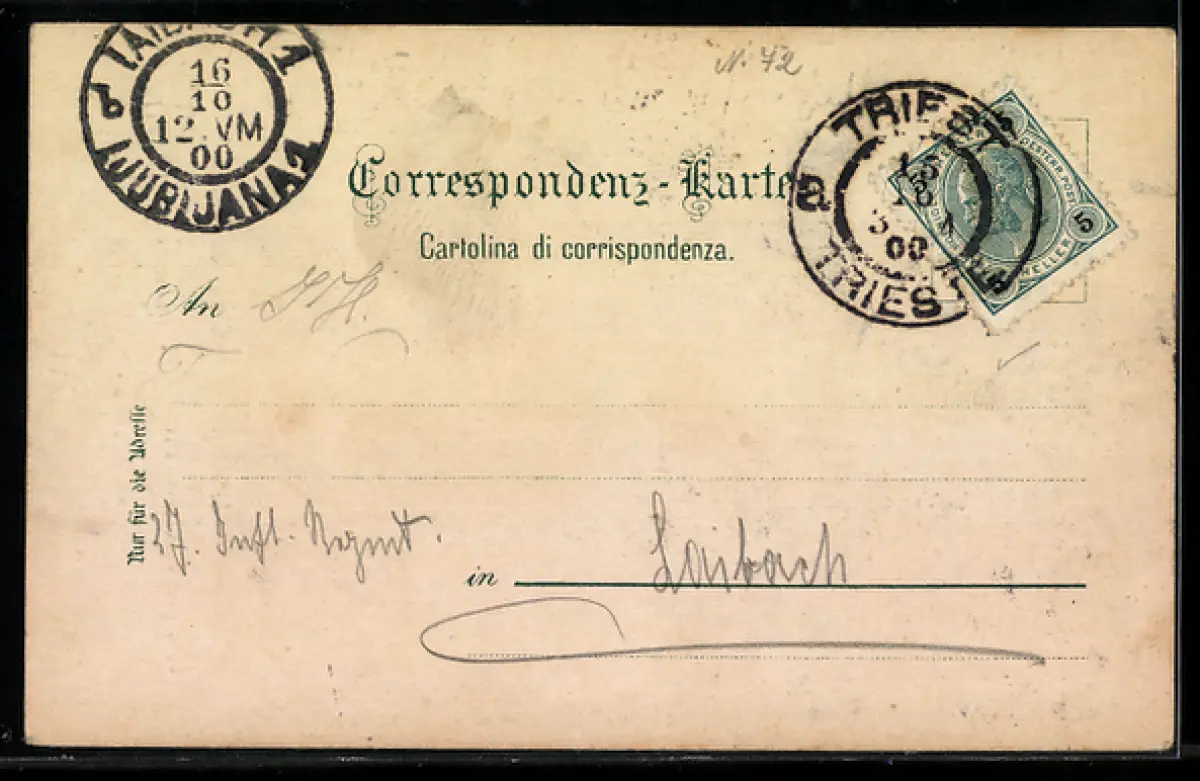 alte Ansichtskarte, gelaufen 1900, Ecken bestoßen, Abriebspuren oben, Stempelspur, guter Zustand