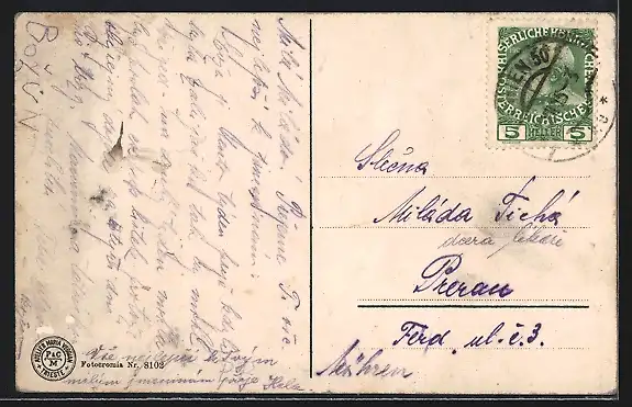gelaufen 1915, Eckknick re. unten, Stempelspur, guter Zustand