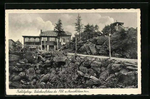 AK Tröstau / Fichtelgeb., Unterkunftshaus des FGV und Aussichtsturm
