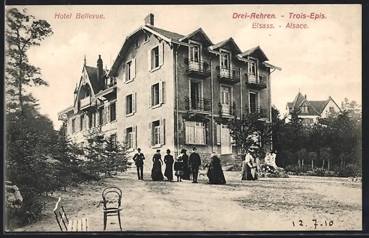 AK Trois-Épis, Vue de l`Hôtel Bellevue avec des personnes devant l`entrée