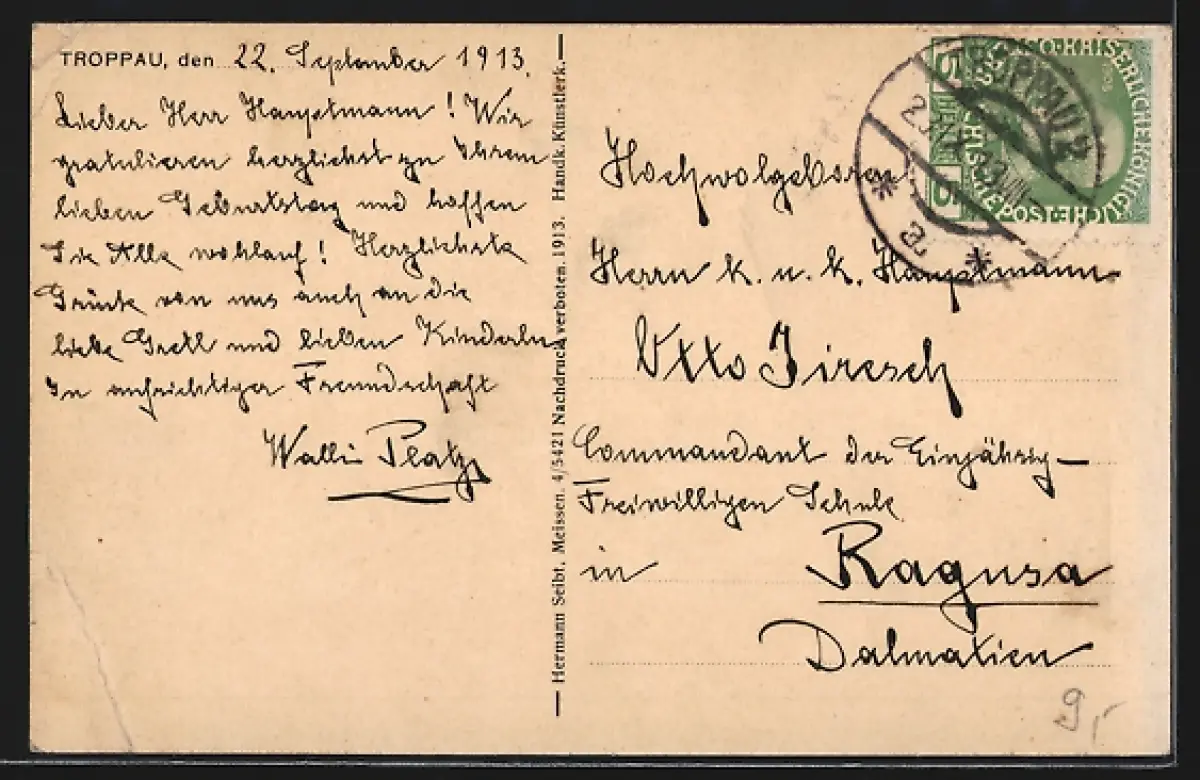 gelaufen 1913, Eckknick re. unten, rückseitig Klebe- und Papierreste, Stempelspur, guter Zustand