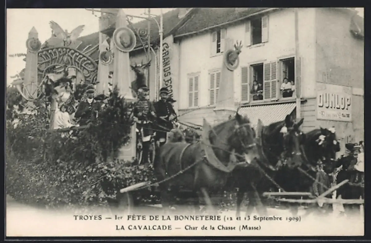 AK Troyes, 1er Fête de la Bonneterie 1909, La Cavalcade, Char de la Chasse