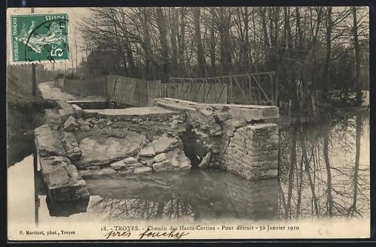 AK Troyes, Chemin des Hauts-Cortins, Pont détruit 1910, Hochwasser
