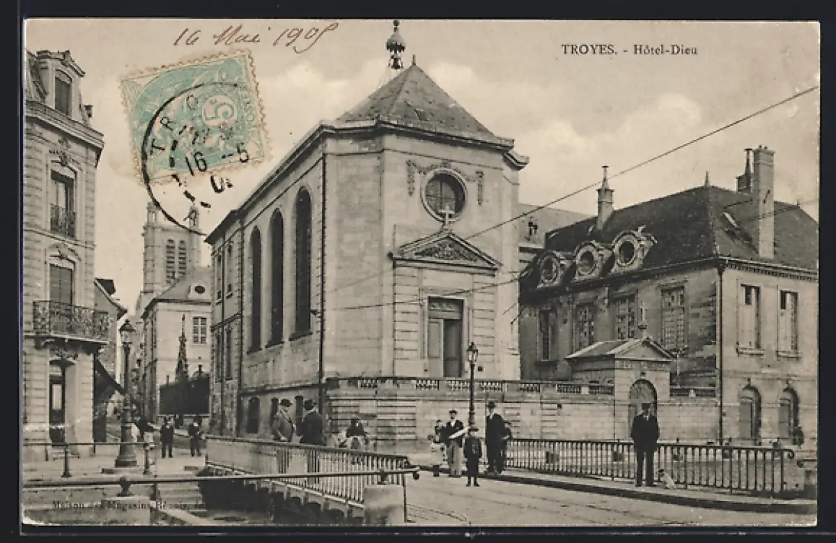 AK Troyes, Hôtel-Dieu et scène de rue animée