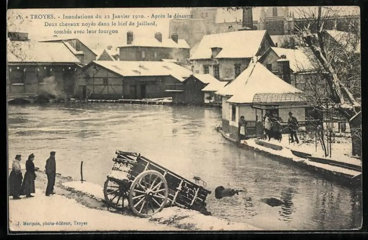 AK Troyes, Inondations du 22 Janvier 1910, Après le désastre, Deux chevaux noyés le bief de jaillard