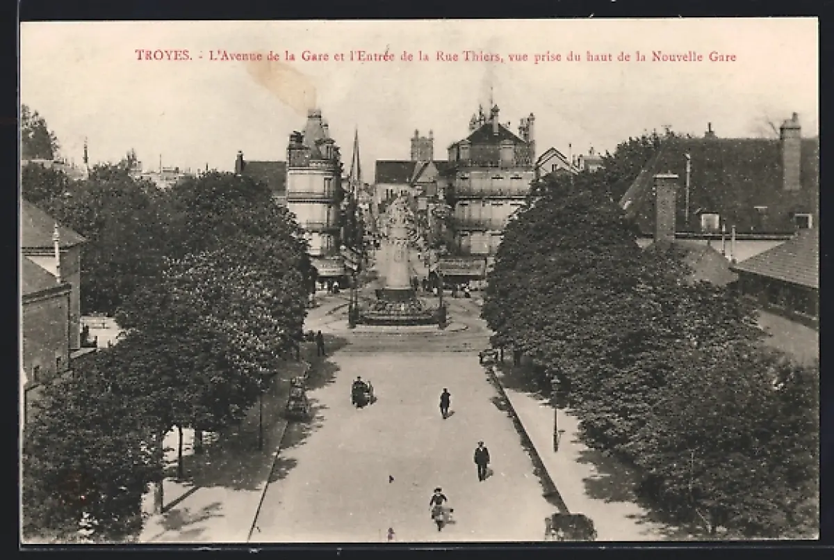 AK Troyes, L`Avenue de la Gare et l`entrée de la Rue Thiers vue du haut de la Nouvelle Gare