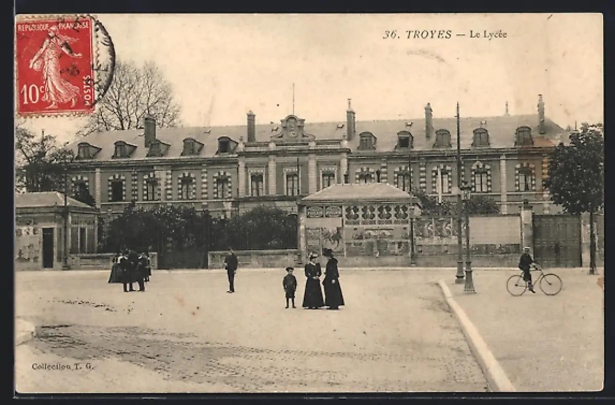 AK Troyes, Le Lycée et la place animée avec des passants et un cycliste