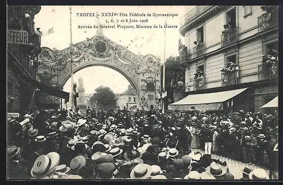 AK Troyes, XXXIV. Fete Federale de Gymnastique 5-8 Juin 1908, Arrivee du General Picquart, Ministre de la Guerre