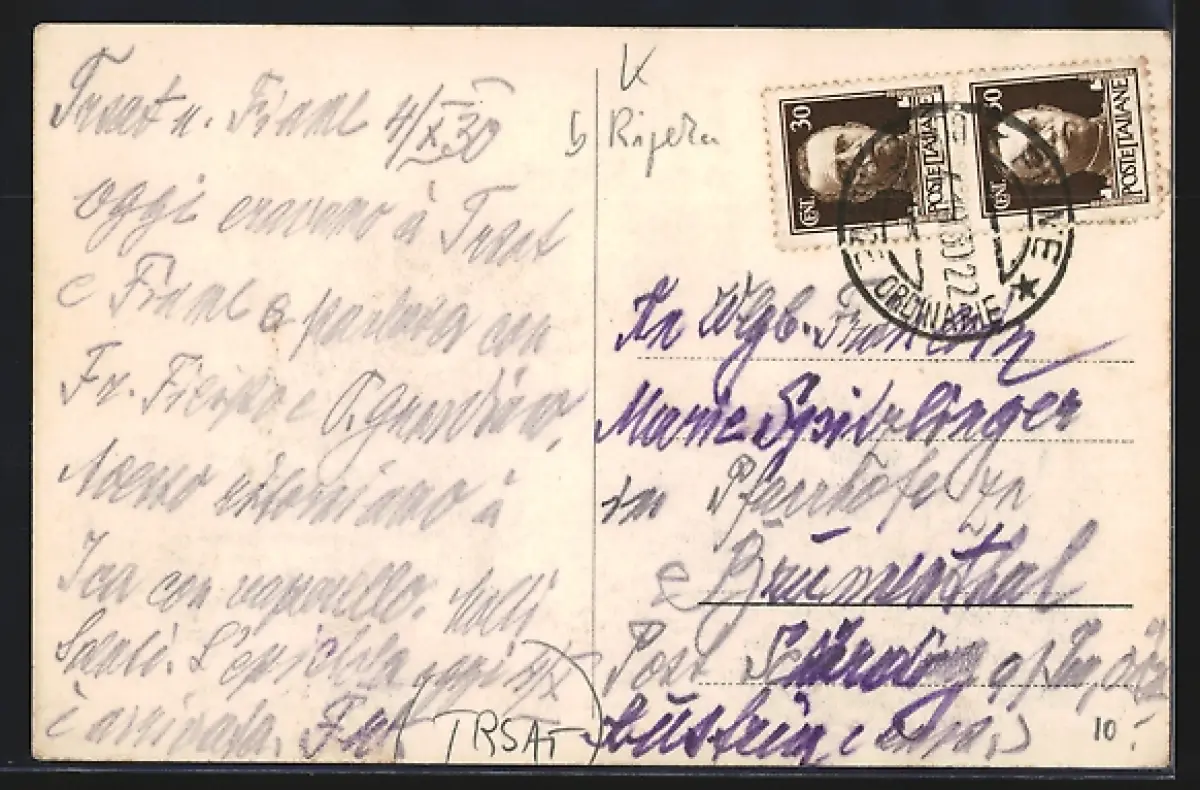 Personenbezogene Daten auf der Rückseite der Karte wurden durch blauen Textmarker unkenntlich gemacht. Die blauen Stellen sind auf die Vorderseite durchgeweicht und wirken sich negativ auf das Postkartenfoto aus