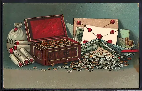 AK Truhe, Sack und Rollen mit Geldmünzen, Geldscheine, versiegelte Briefe