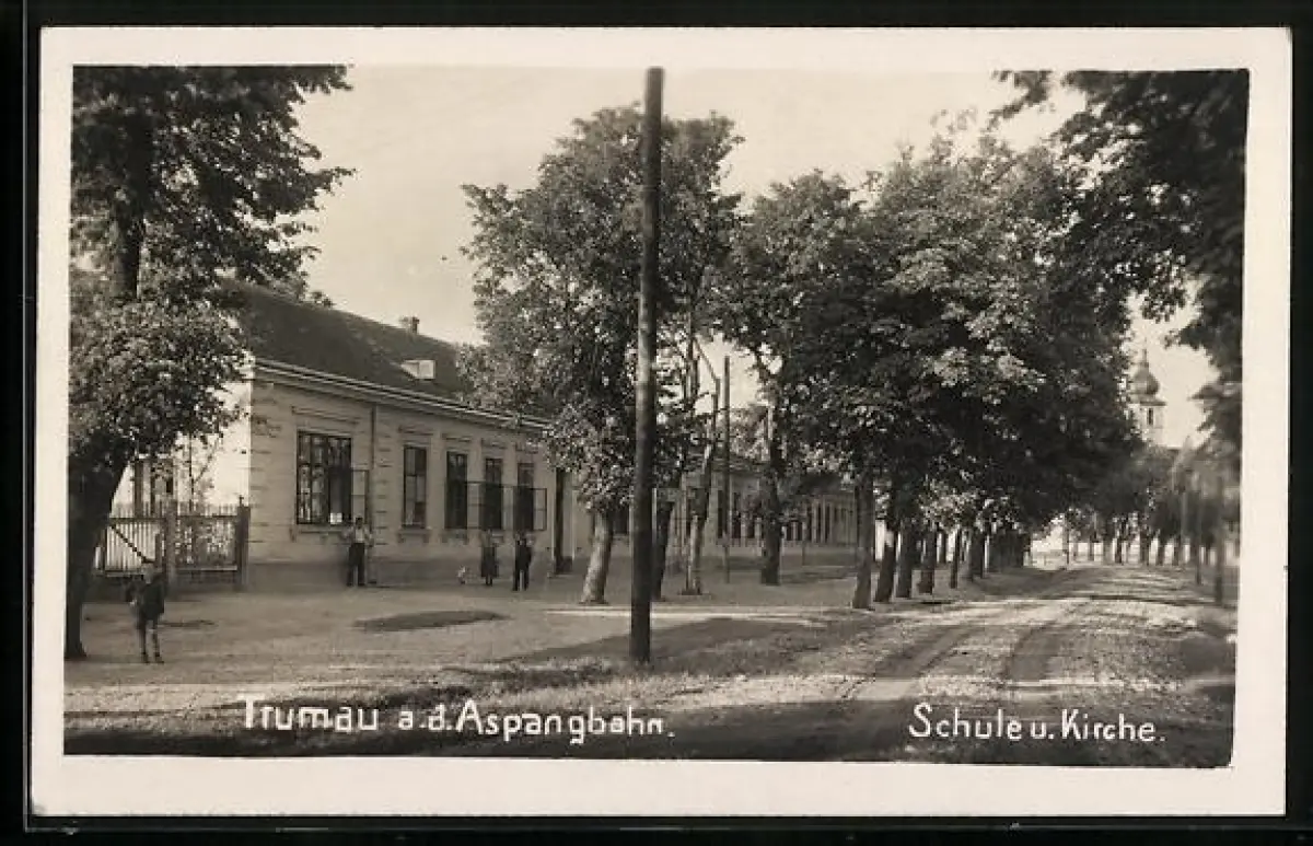 AK Trumau a. d. Aspangbahn, Schule und Kirche mit Strassenpartie