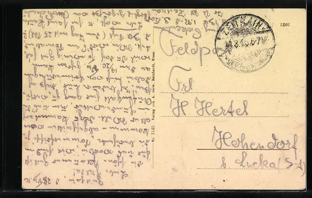 Personenbezogene Daten auf der Rückseite der Karte wurden durch blauen Textmarker unkenntlich gemacht. Die blauen Stellen sind auf die Vorderseite durchgeweicht und wirken sich negativ auf das Postkartenfoto aus