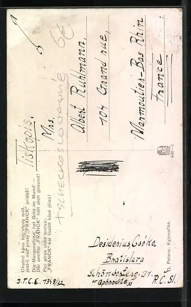 Personenbezogene Daten auf der Rückseite der Karte wurden durch blauen Textmarker unkenntlich gemacht. Die blauen Stellen sind auf die Vorderseite durchgeweicht und wirken sich negativ auf das Postkartenfoto aus