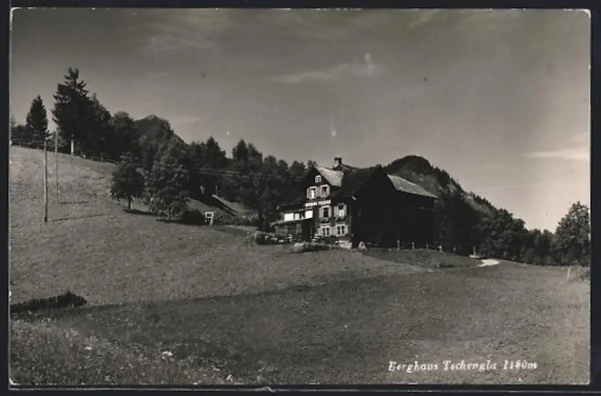 AK Tschengla, Berghaus mit Gebirge in der Distanz
