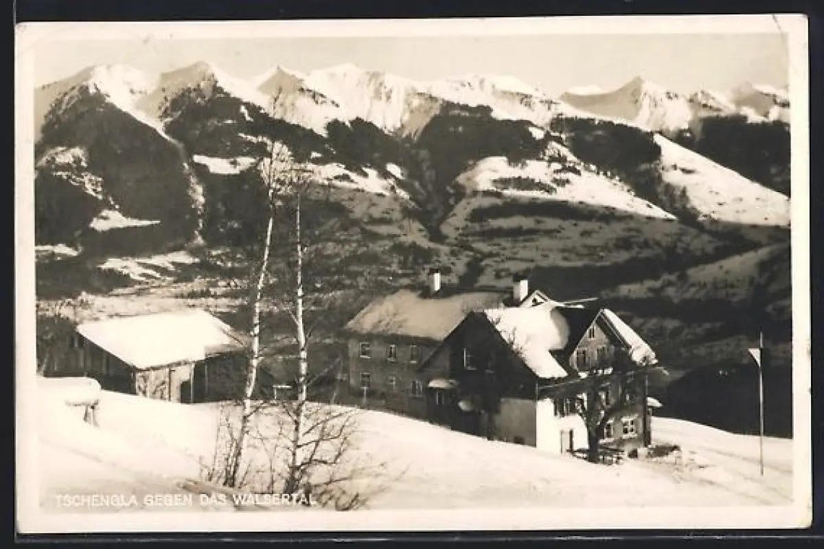 AK Tschengla, Ortspartie gegen das Walsertal im Winter