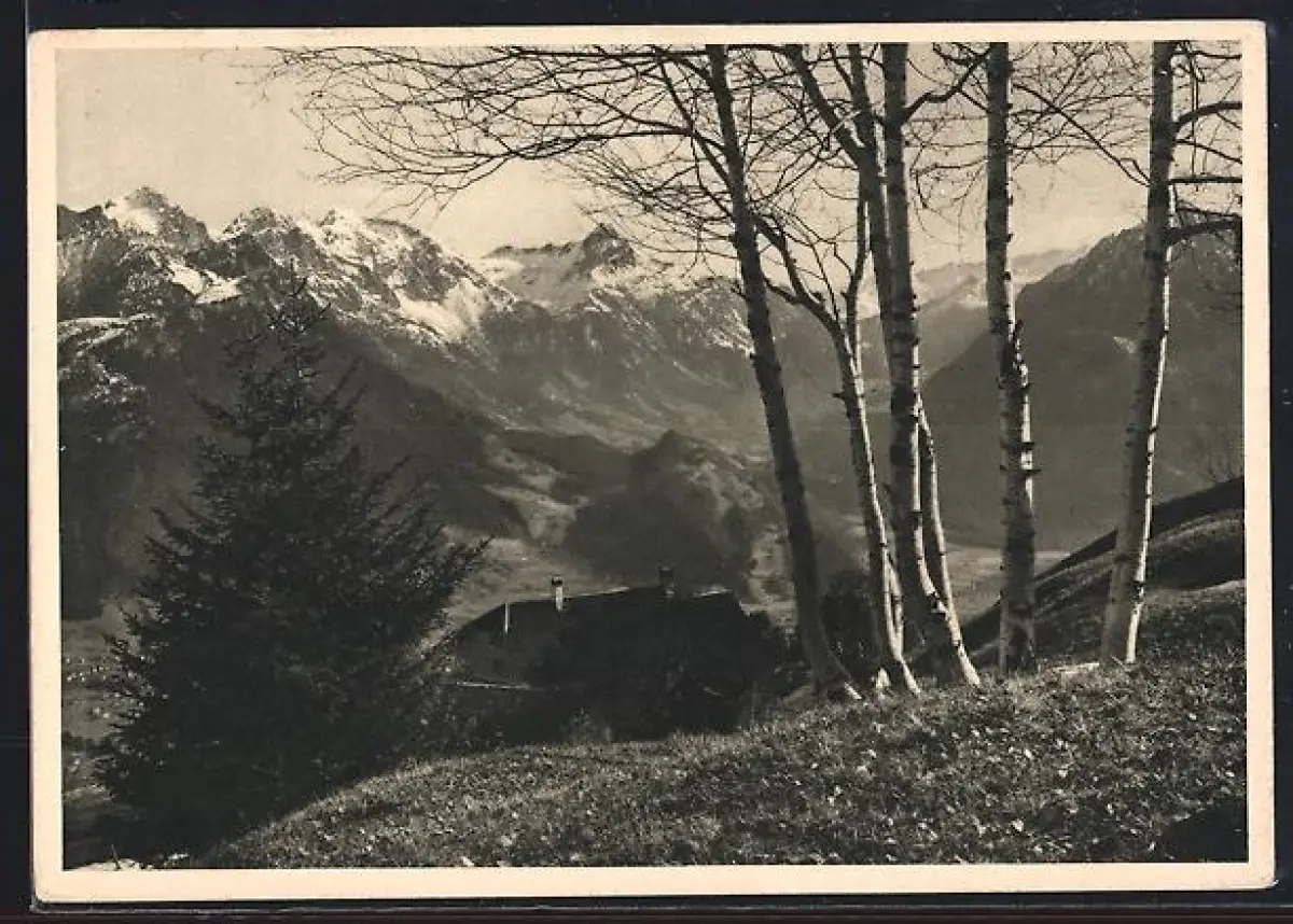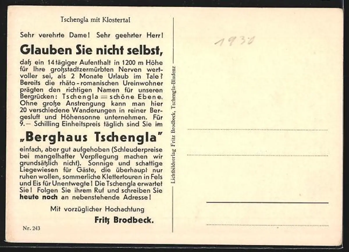 AK Tschengla, Teilansicht vom Berghang aus mit Klostertal