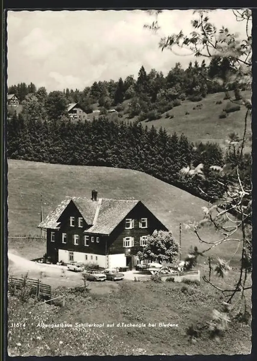 AK Tschengla bei Bludenz, Alpengasthaus Schillerkopf mit Umgebung aus der Vogelschau