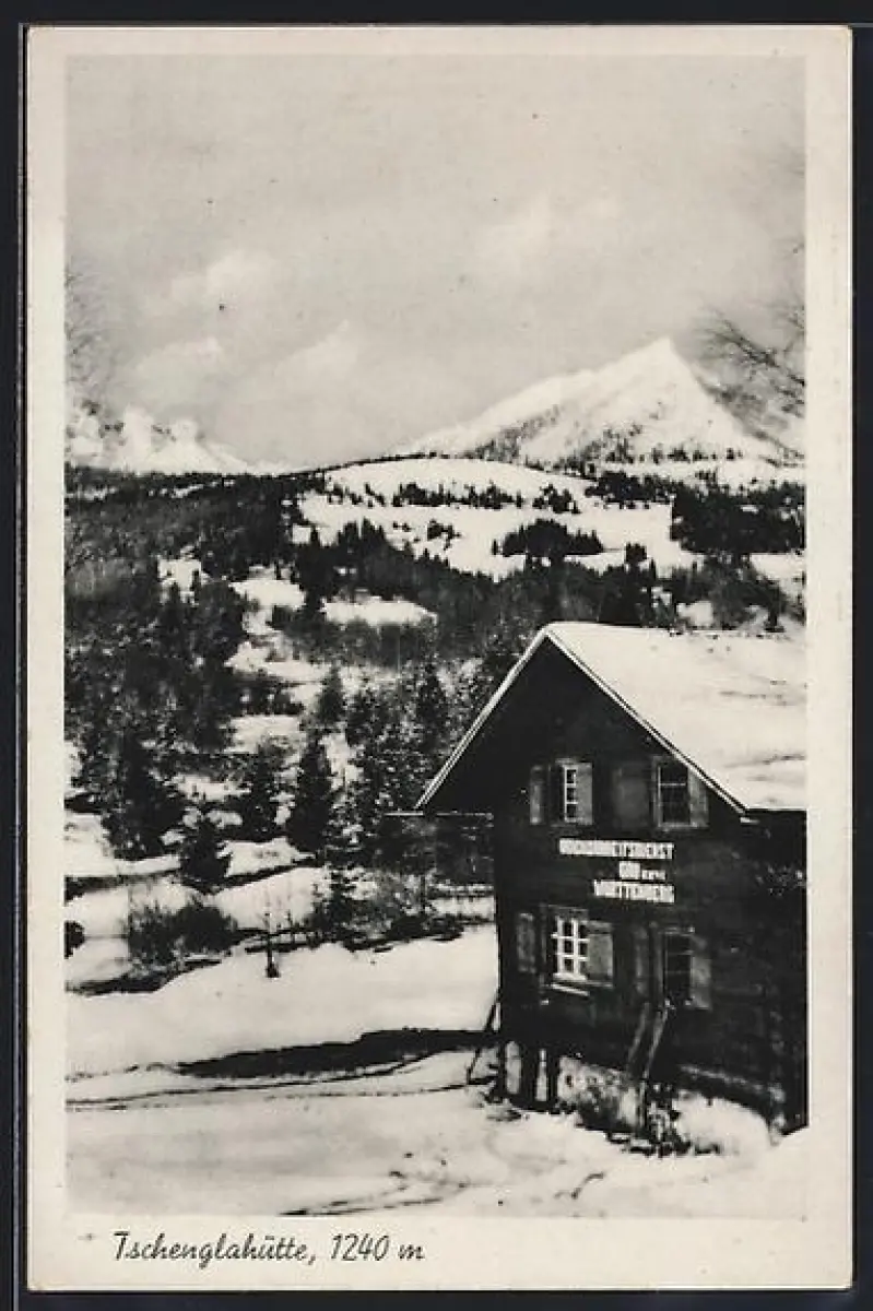 AK Tschenglahütte, Mit schneebedecktem Wald im Hintergrund