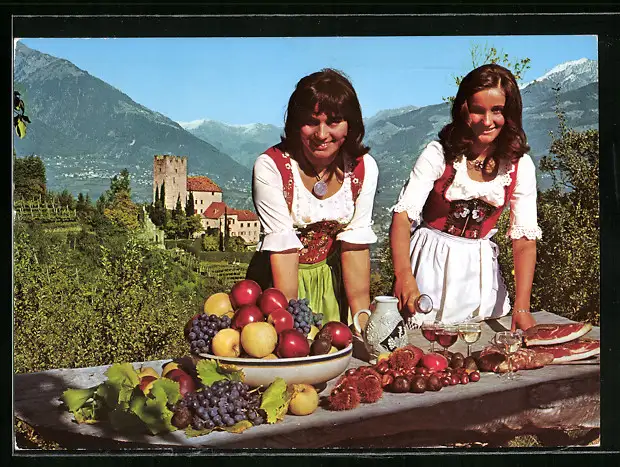 AK Tscherms, Buschenschenke-Jausenstation Heidenhof mit zwei hübschen Mädchen und Obst im Angebot