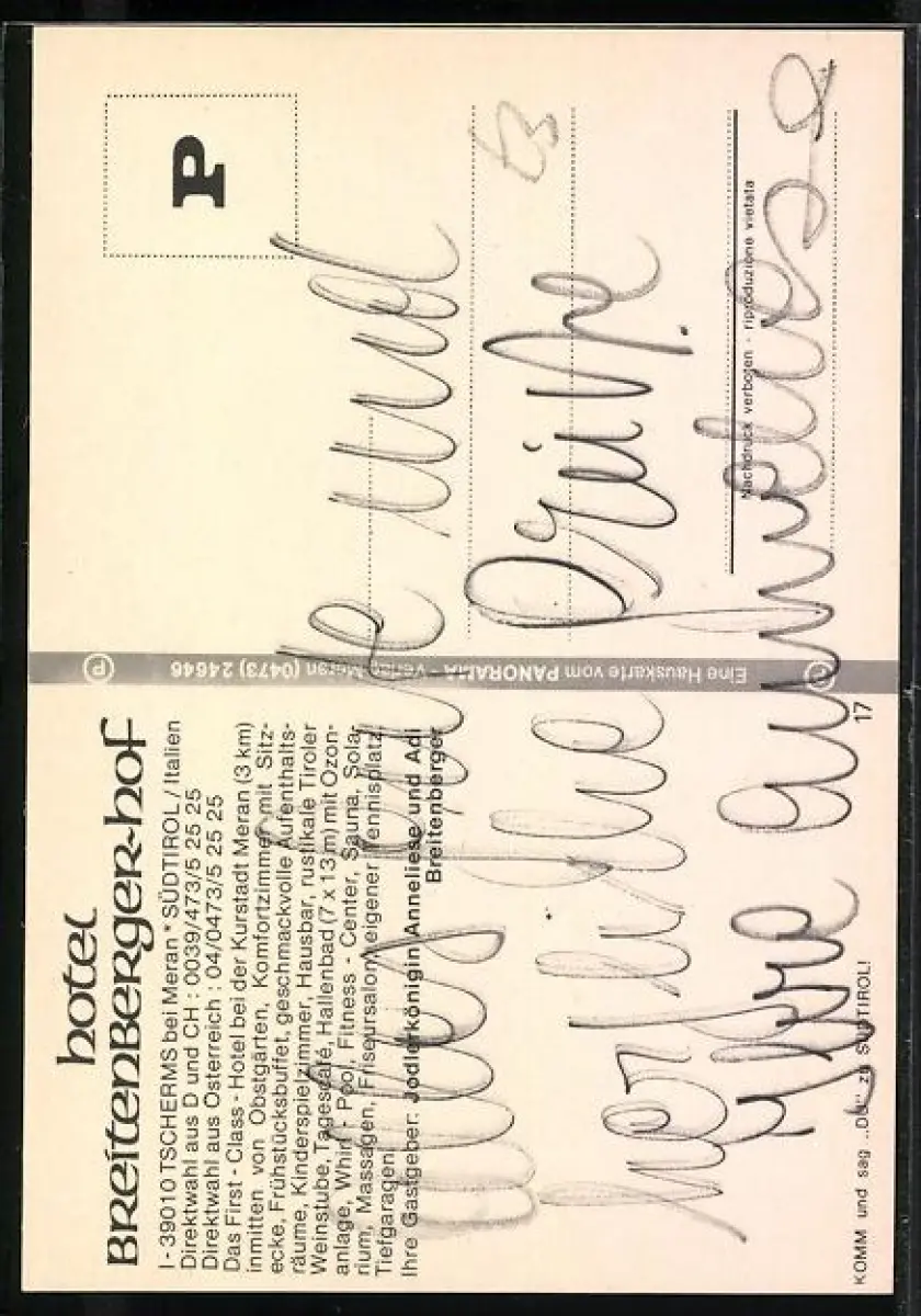 AK Tscherms bei Meran, Hotel Breitenberger Hof, Jodlerkönigin Anneliese und Adi Breitenberger, rückseitig Autographen