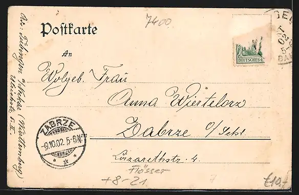 alte Ansichtskarte, gelaufen 1902, Briefmarke entfernt, rückseitig Oberflächenschaden, Eckknick li. unten, Eckknick li. unten, guter Zustand