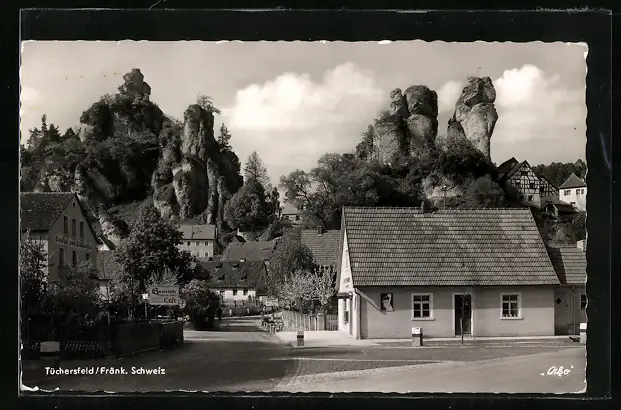 AK Tüchersfeld /Fränk. Schweiz, Strassenpartie vor auffälligen Gesteinsformationen
