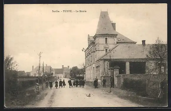 AK Tuffé, La Mairie et groupe de personnes sur la route
