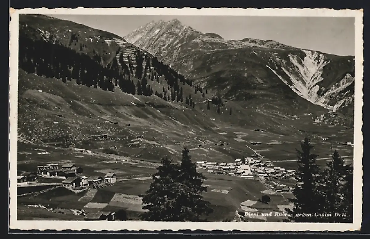 AK Tujetsch, Dieni, Blick auf den Ort und Ruèras gegen Cuolm Devi