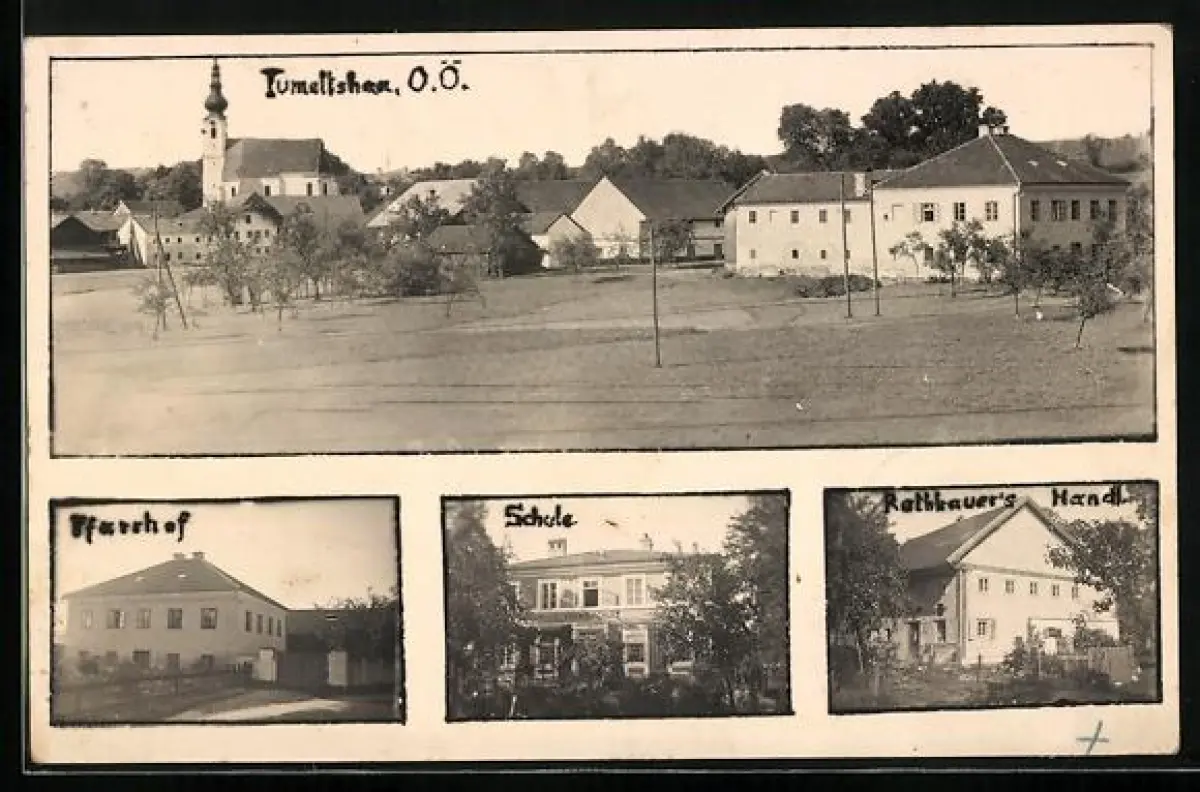 AK Tumeltsham, Rathhauer's Warenhandlung, Pfarrhof und Schule