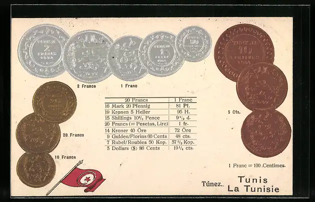 AK Tunesien, versch. Geldstücke, Franc, Centimes, Fahne