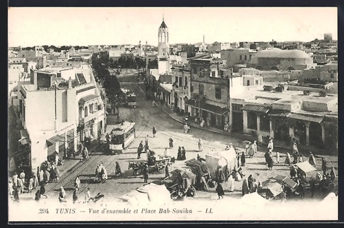 AK Tunis, Vue d`ensemble et Place Bab-Souika, Strassenbahn