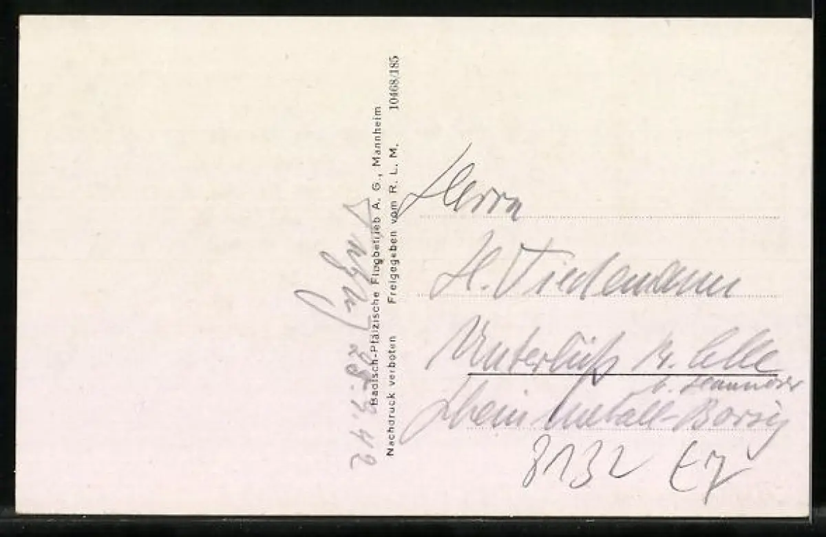 Personenbezogene Daten auf der Rückseite der Karte wurden durch blauen Textmarker unkenntlich gemacht. Die blauen Stellen sind auf die Vorderseite durchgeweicht und wirken sich negativ auf das Postkartenfoto aus