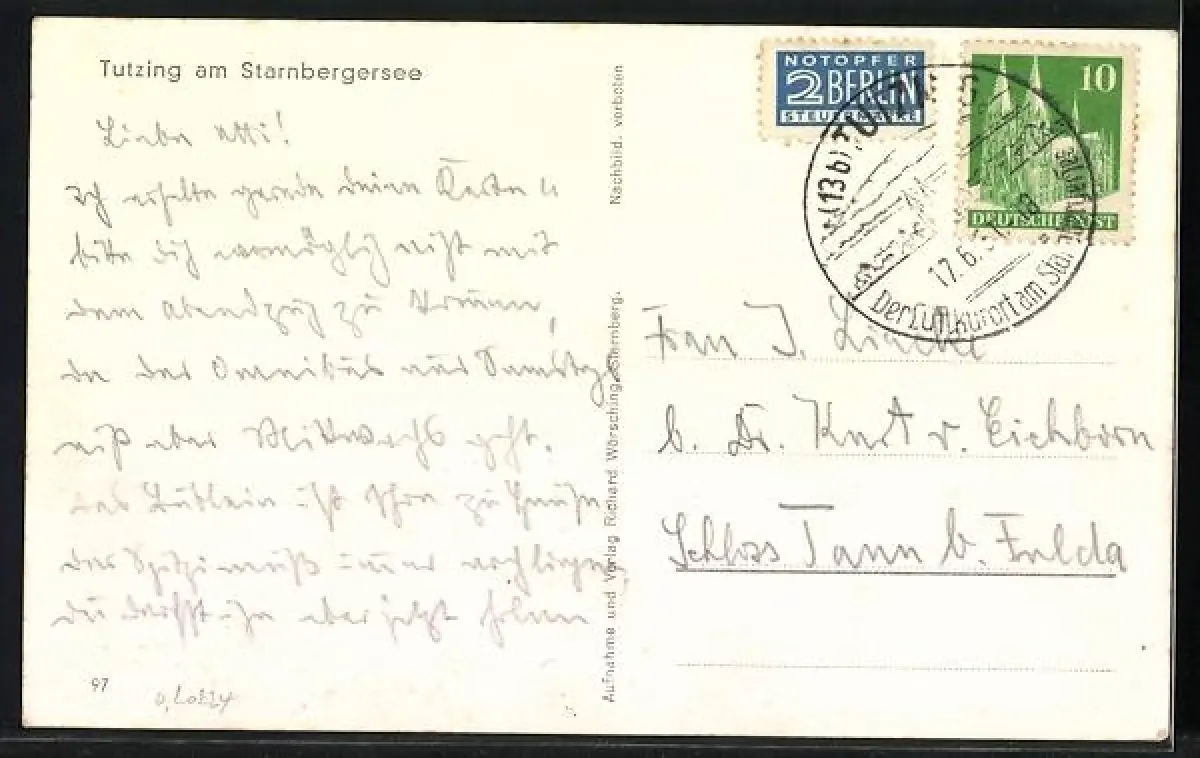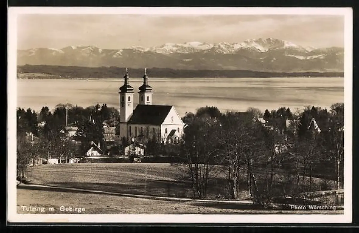 AK Tutzing, Kirche mit Starnbergersee im Hintergrund