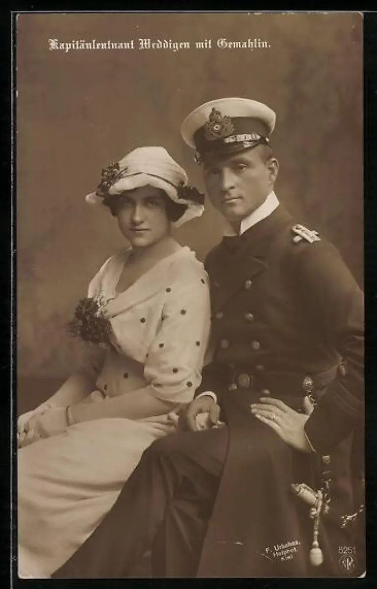 AK U-Boot-Kapitänleutnant Otto Weddigen in Uniform mit seiner Frau, Kmdt. von U-9 und U-29