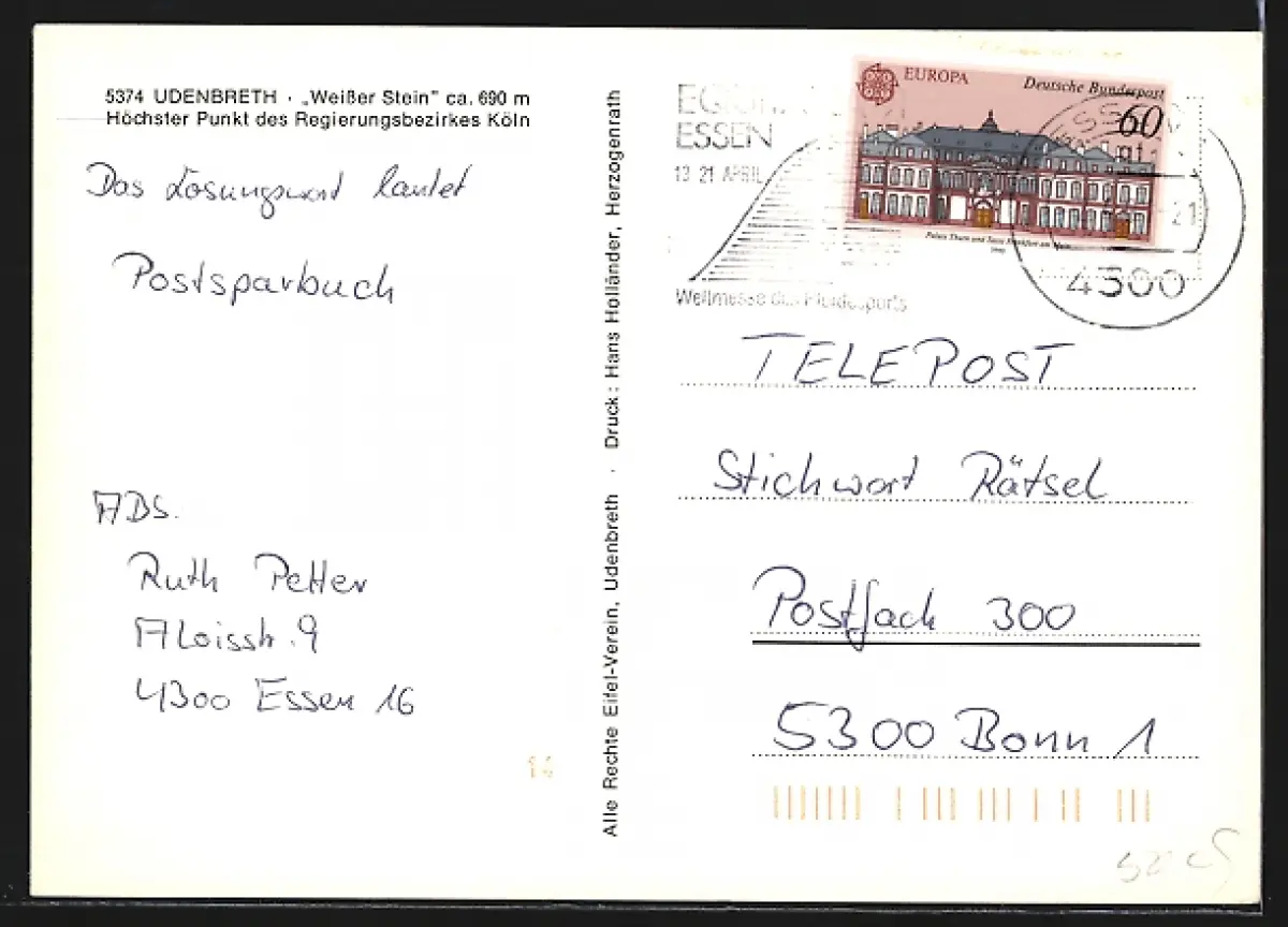 Personenbezogene Daten auf der Rückseite der Karte wurden durch blauen Textmarker unkenntlich gemacht. Die blauen Stellen sind auf die Vorderseite durchgeweicht und wirken sich negativ auf das Postkartenfoto aus