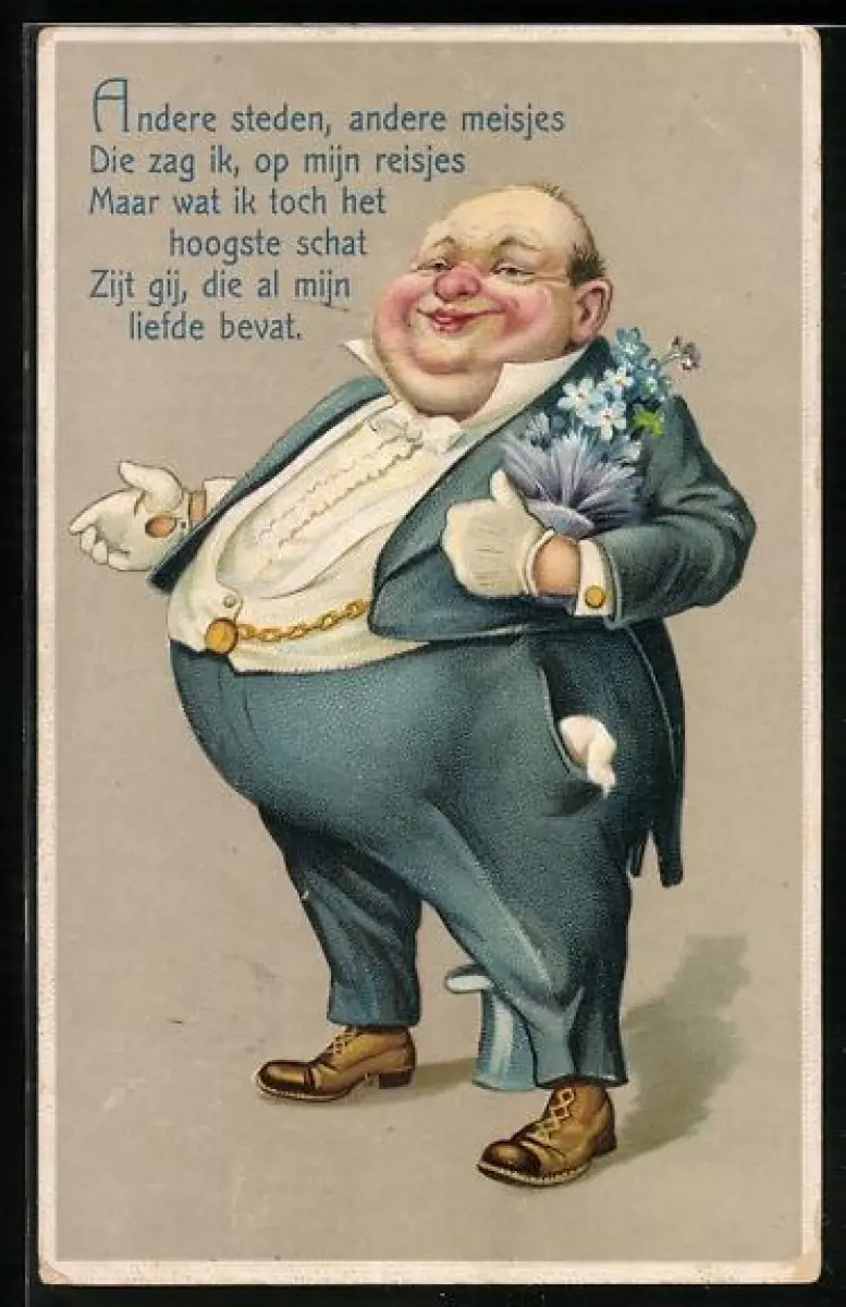 AK Übergewichtiger Frauenheld mit Taschenuhr und Blumen